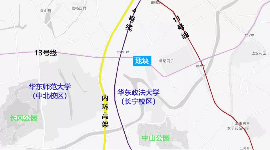 该地块坐落长风新村大街,东至白玉路及南林家港多层住所、南至顺义路、西至规划石湾路、北至宁夏路,归于内环内。地块附近4、13号线金沙江路站、周边有华东师范和华东政法大学。