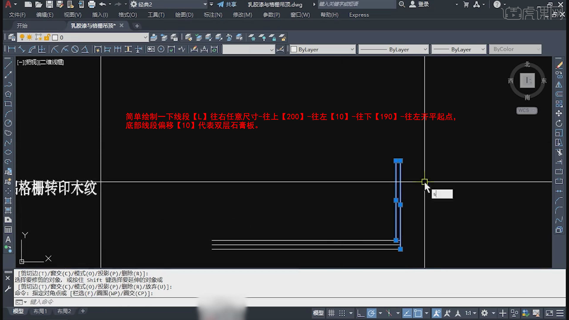 5.简略制作一下线段【L】往右恣意尺度-往上【200】-往左【10】-往下【190】-往左齐平起点,底部线】代表双层石膏板。