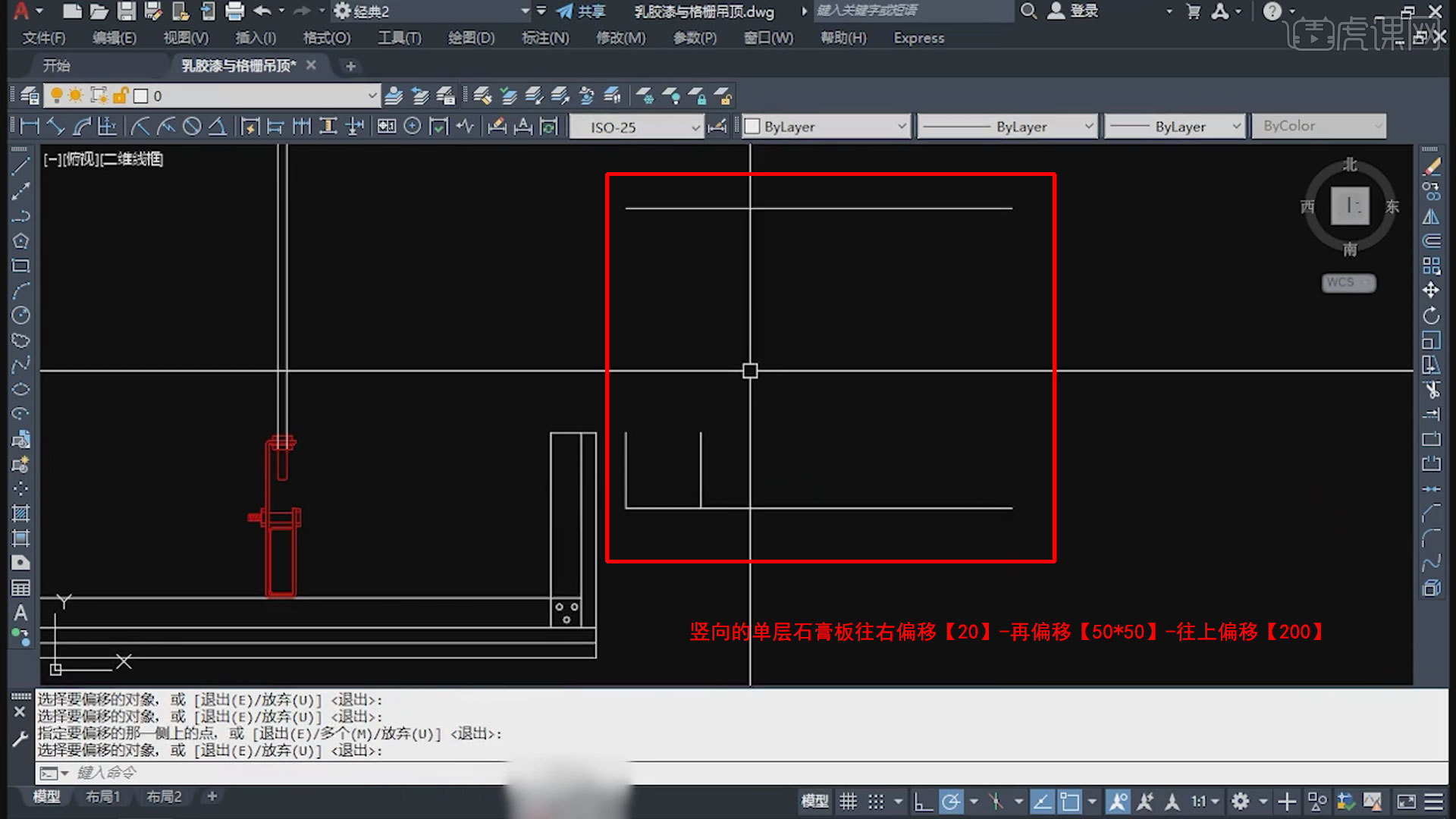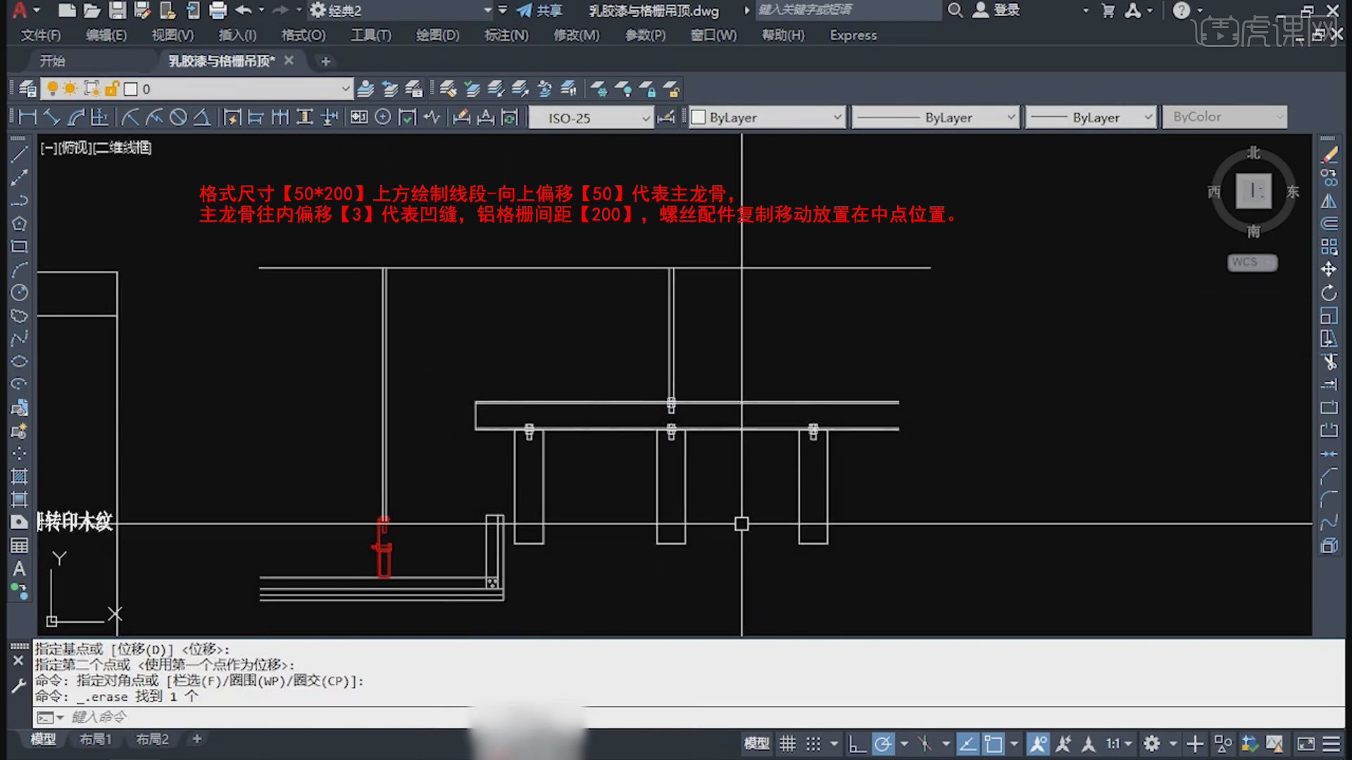 7.主龙骨,吊件,吊杆仿制移动过来,放置在相应方位,吊杆上方制作线段代表【原始顶】,竖向的单层石膏板往右偏移【20】-再偏移【50*50】-往上偏移【200】。