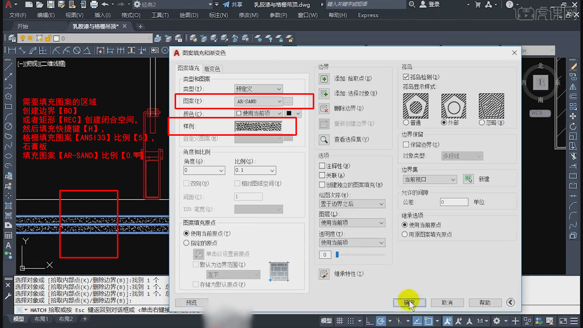 9.需求填充图画的区域创立鸿沟【BO】或许矩形【REC】创立闭合空间,然后填充快捷键【H】,格栅填充图画【ANSI33】份额【5】,石膏板填充图画【AR-SAND】份额【0.1】。